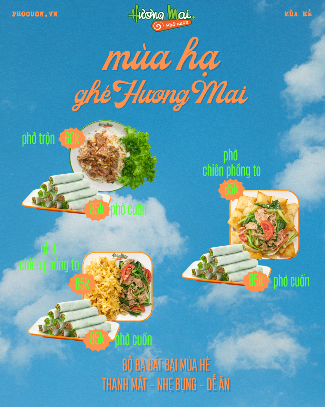Sinh ra từ cái nôi của món Phở Cuốn – Làng Ngũ Xã, Hương Mai là hành trình kế thừa và phát triển phở cuốn của 3 thế hệ gia đình gốc Hà Nội. Bắt nguồn từ tình yêu thương trong lành và niềm đam mê giản dị của bà, của mẹ chúng tôi trong việc bếp núc, việc biến tấu những món ăn truyền thống cố hữu của quê hương dường như trở thành một niềm vui, một sự hào hứng, một món quà bất ngờ cho mỗi đứa trẻ chúng tôi trong những bữa ăn gia đình. Vào những buổi trưa hè, thay vì tần ngần trước bát cơm nóng hôi hổi cùng tô canh nghi ngút khói, chúng tôi mê mẩn những cuộn phở mát lành, với tiếng nhai giòn từ rau thịt ngay sau khi thả đẫm trong thứ nước chấm chua ngọt thanh thuần.